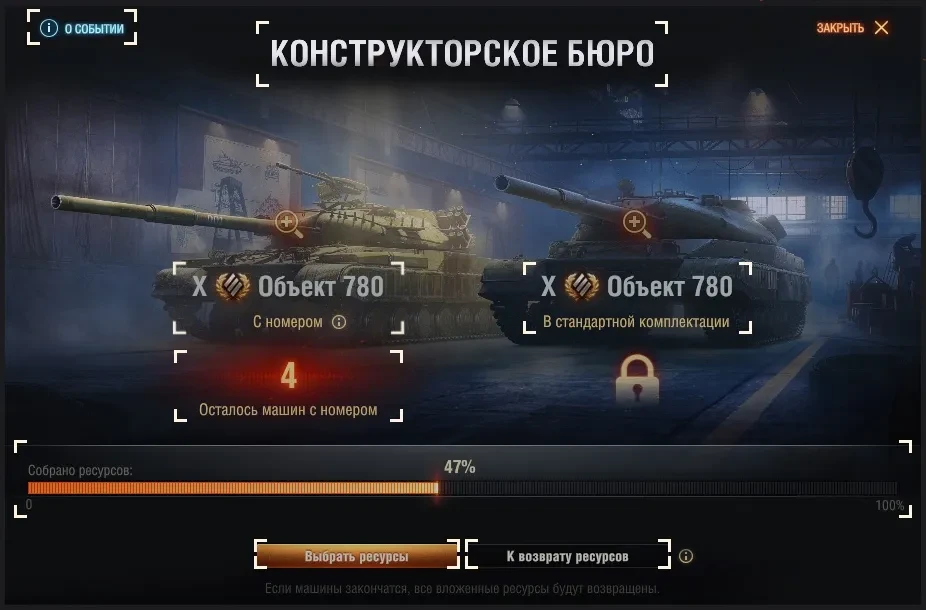 Главная особенность Конструкторского бюро — возможность выбора ресурсов. Вы сами определяете лучшее для вам соотношение ресурсов для получения Объекта 780. А при удаче, и 3D-стиля «Варан». Как это работает: