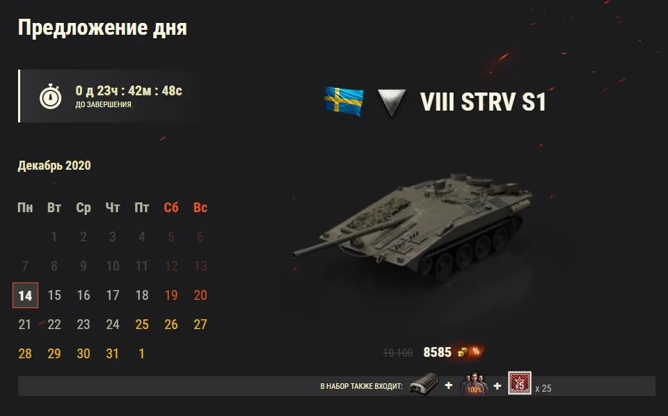 - С 14 декабря 09:00 (МСК) до 15 декабря 09:00 (МСК) премиум танк дня — Strv S1.