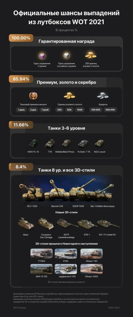 И что же побудило сделать это нашу любимую компанию? Летом 2020 года World of Tanks официально вышел в Китае, а по законодательству данной страны все шансы на выпадения из лутбоксов должны отрыто демонстрироваться. Так что давайте вместе взглянем на ваши шансы вытащить что-либо из коробок 2021 года (см. картинку).