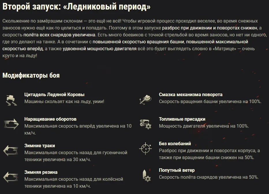 Сезон праздников в самом разгаре, и Аркада возвращается с парочкой подходящих зимних активностей: «Игра в снежки» и «Ледниковый период». Оба набора правил изменят физику игры, чтобы подарить вам беззаботное веселье. Бои будут проходить на шести заснеженных картах на технике VIII или X уровня.
