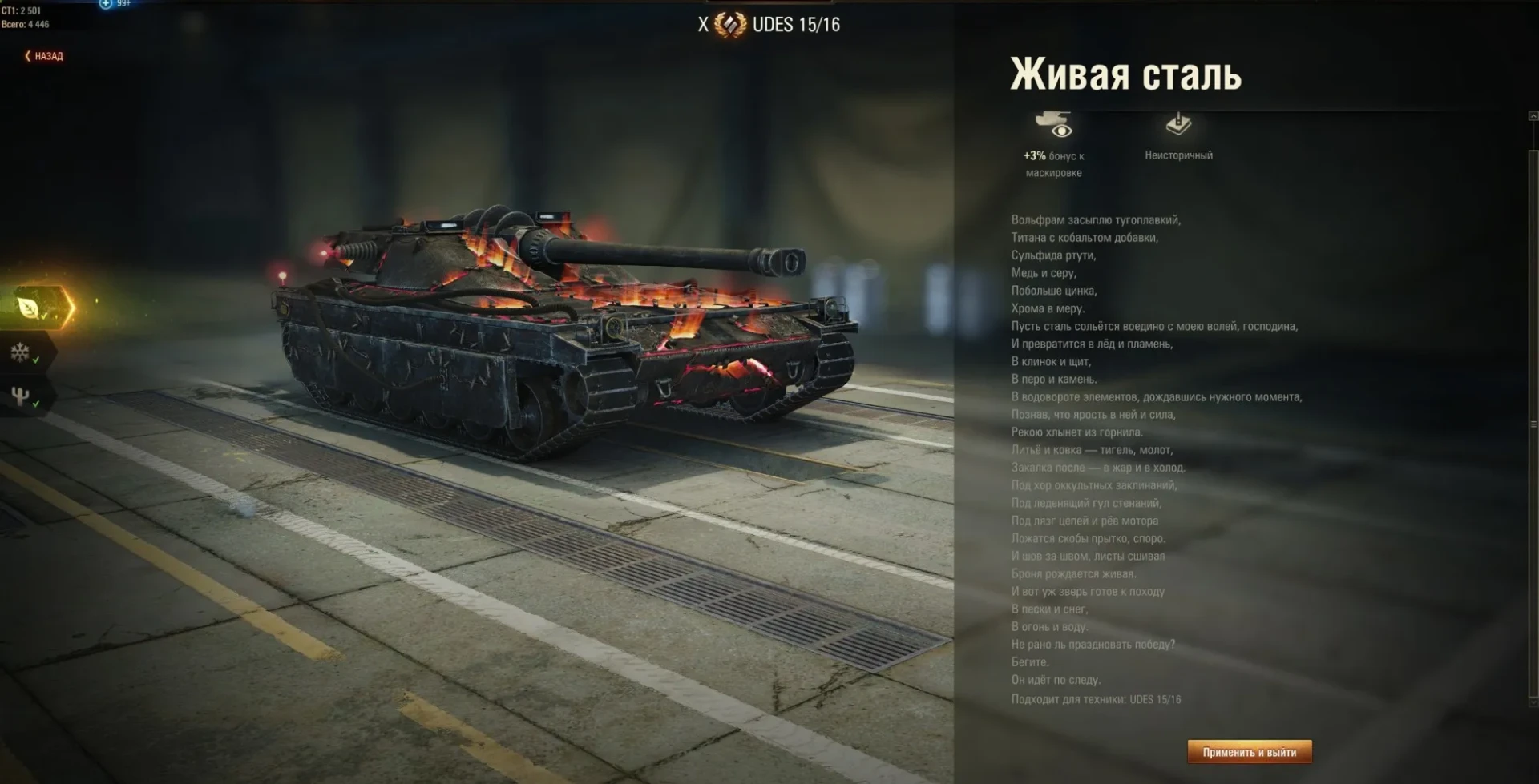 - 2D- и 3D-стили. Среди них «Десятый олень» (ссылка) для Pz.Kpfw. VII, «Живая сталь» (ссылка) для UDES 15/16 и другие. В наличии наборы в том числе за кредиты.