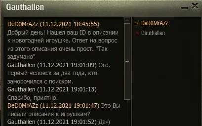 Мы видели эту игрушку ещё в прошлом году. Сама игрушка и описание такое же как и в 2020 г. Ещё тогда мы нашли разработчика Gauthallenа по ID аккаунта в описании игрушки, но до конца не понимали, как он связан с ними. Ну так вот игрок написал ему лично, что сильно порадовало Gauthallenа. И теперь мы можем предположить, что именно он отвечает за текст в игрушках, может даже и во всех.